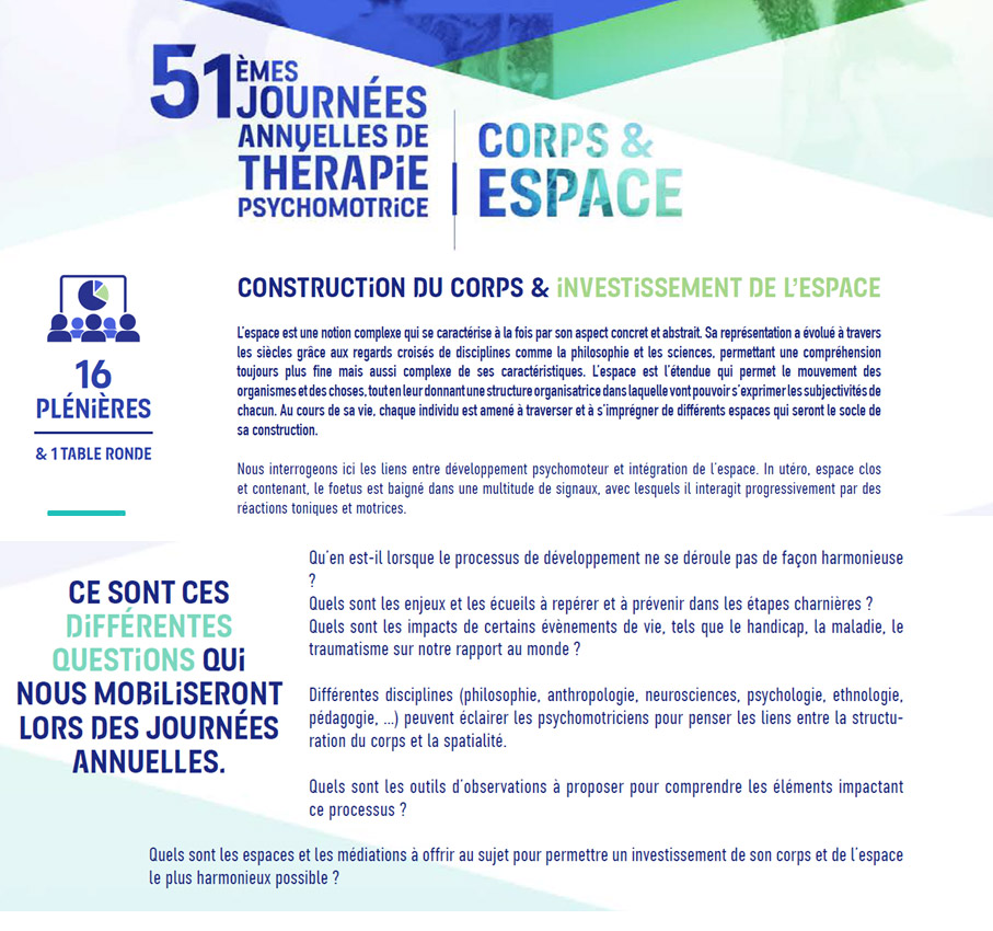 Autour de 16 plénières, 6 symposiums et 12 ateliers, nous nous retrouverons pour échanger, élaborer, pratiquer cette articulation Corps et Espace.